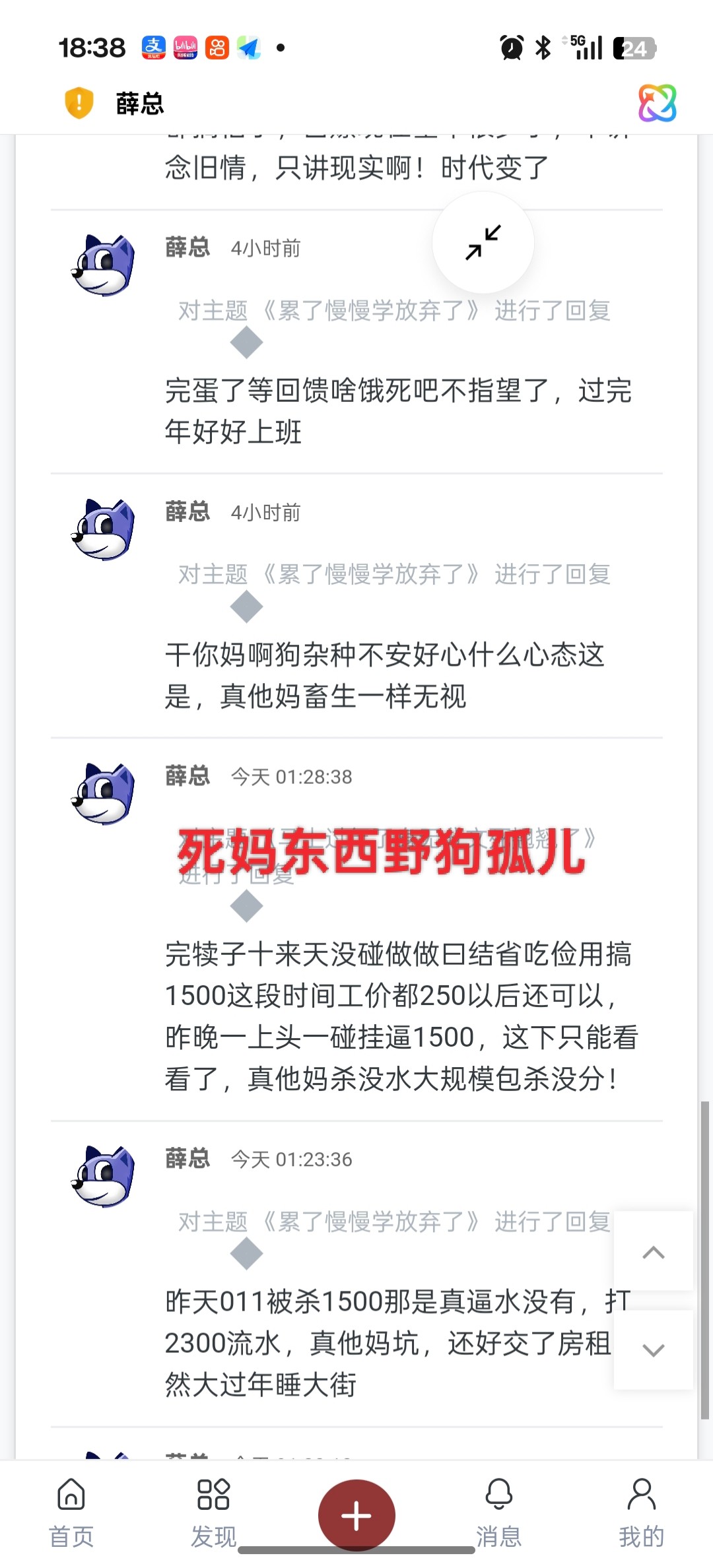 薛总 我是你爹狗杂碎天天发一些没用的帖子老酸菜,重复来重复去没一点营养,刷你妈个逼毛
