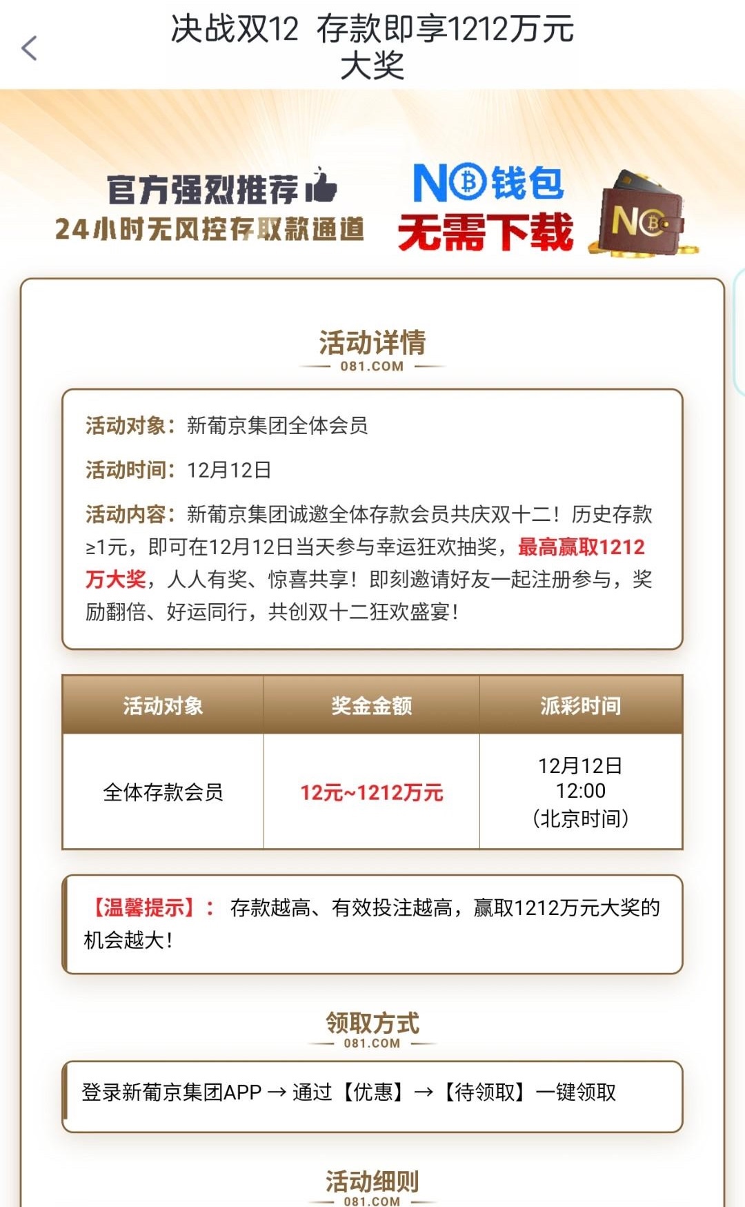 历史存款≥1元 即可在12月12日当天中午12点 都上去领取