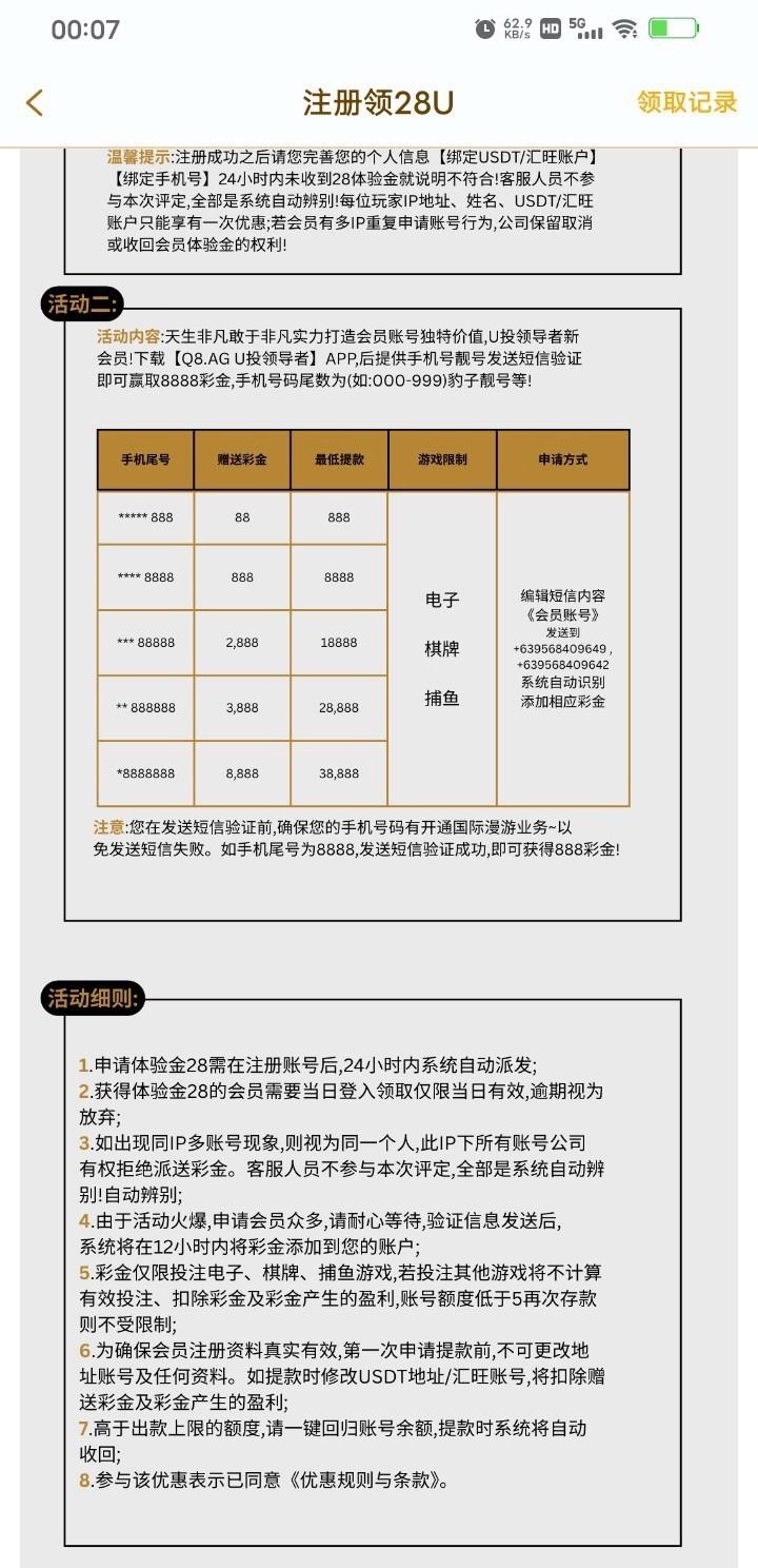 手机尾号三连即可申请88U彩金,发送短信二十分钟左右到账, https://q88.ag