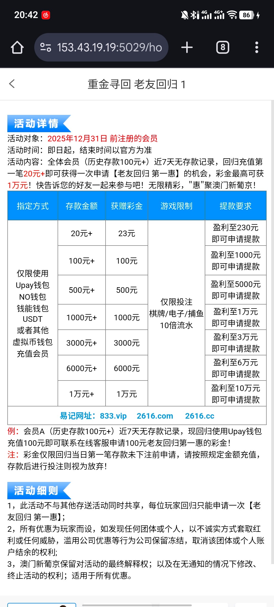 活动内容:全体会员(历史存款100元+)近7天无存款记录,回归充值第一笔20元+即可获得一次申请老友回归第一惠的机会