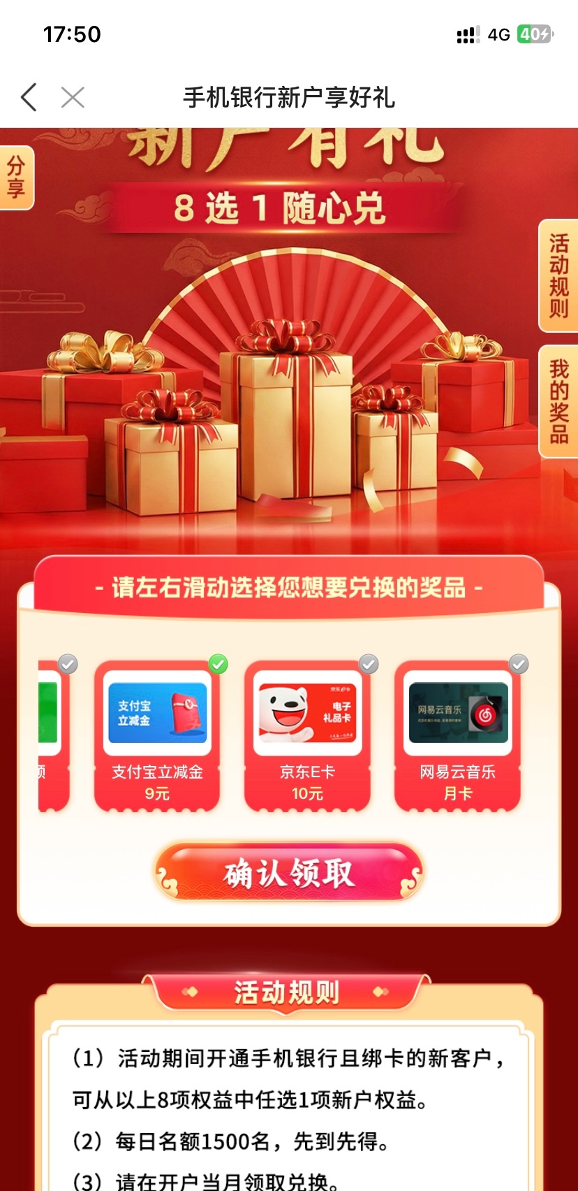 下载微商银行app页面点活动进去8选1自己选有微信支付宝立减金还有e卡