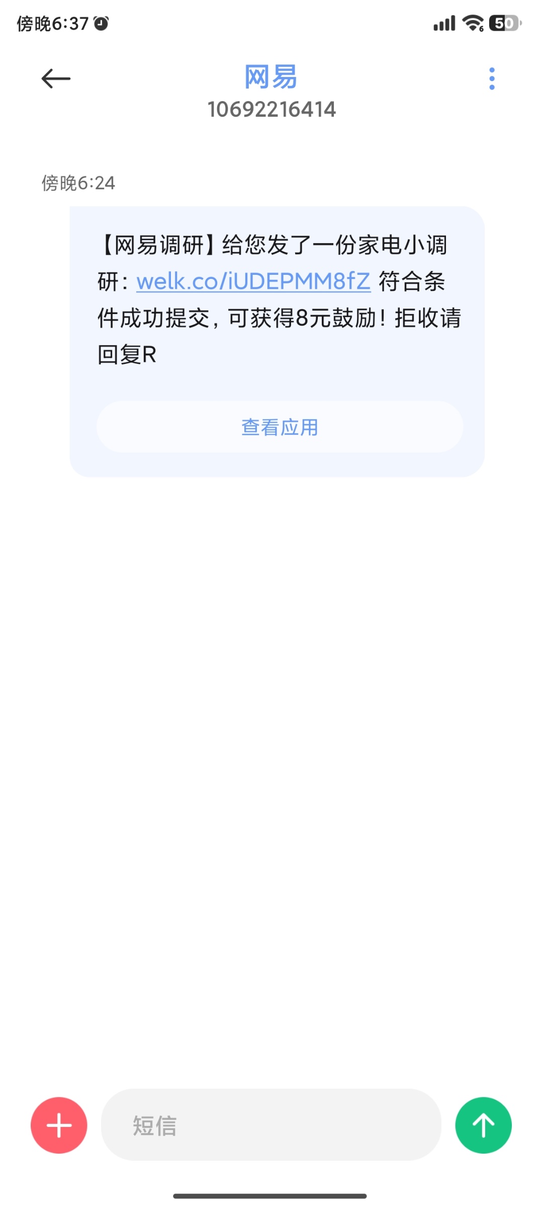 【网易调研】给您发了一份家电小调研:welk.co/iUDEPMM8fZ 符合条件成功提交,可获得8元鼓励!拒收请回复R