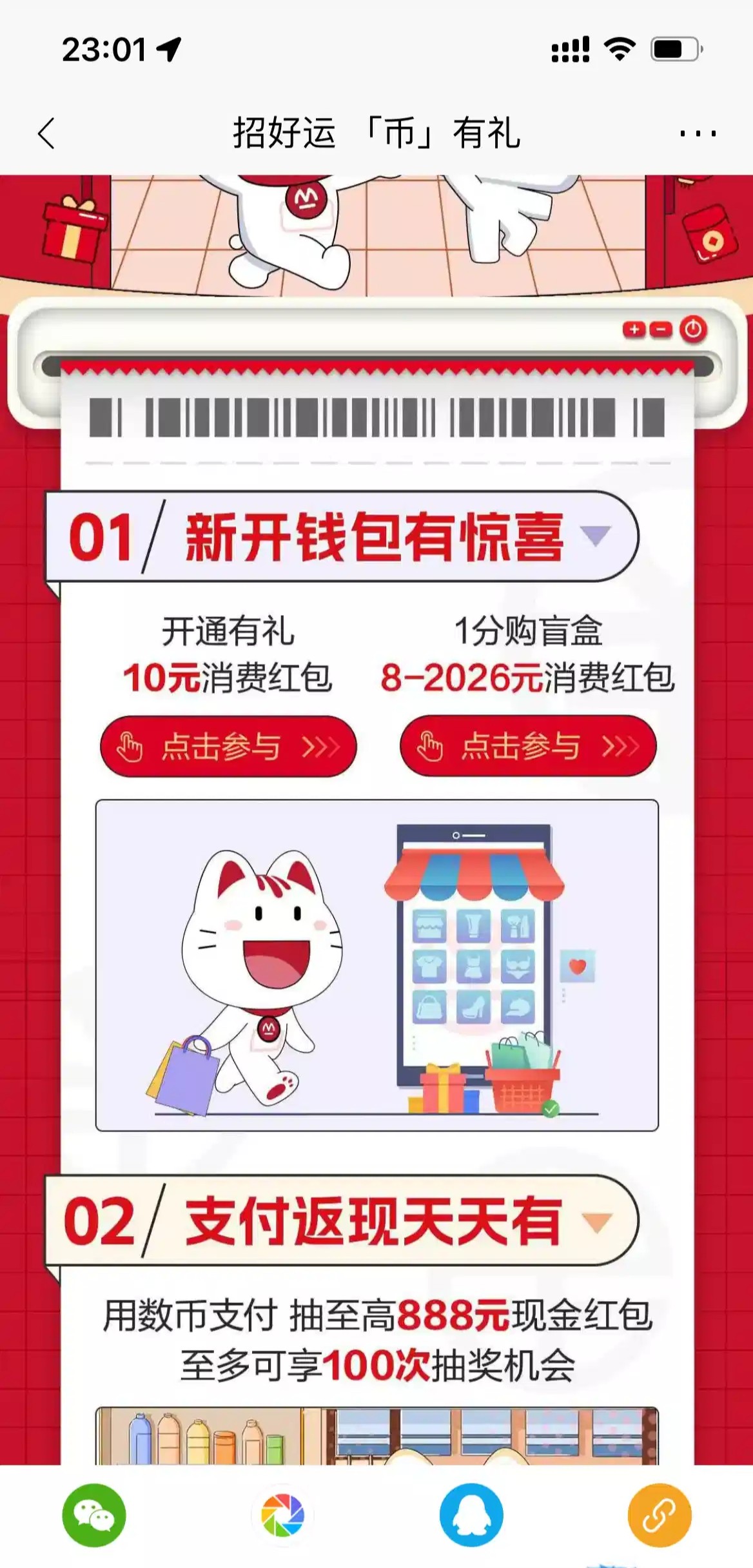 下载招商银行APP,首页搜索数字人民币点击进入,开通数币钱包,可绑定他行卡,开通后升级二类钱包自动到账10红包,用开通的数币钱包支付0.01买盲盒,我盲盒抽到8红包,一共18红包