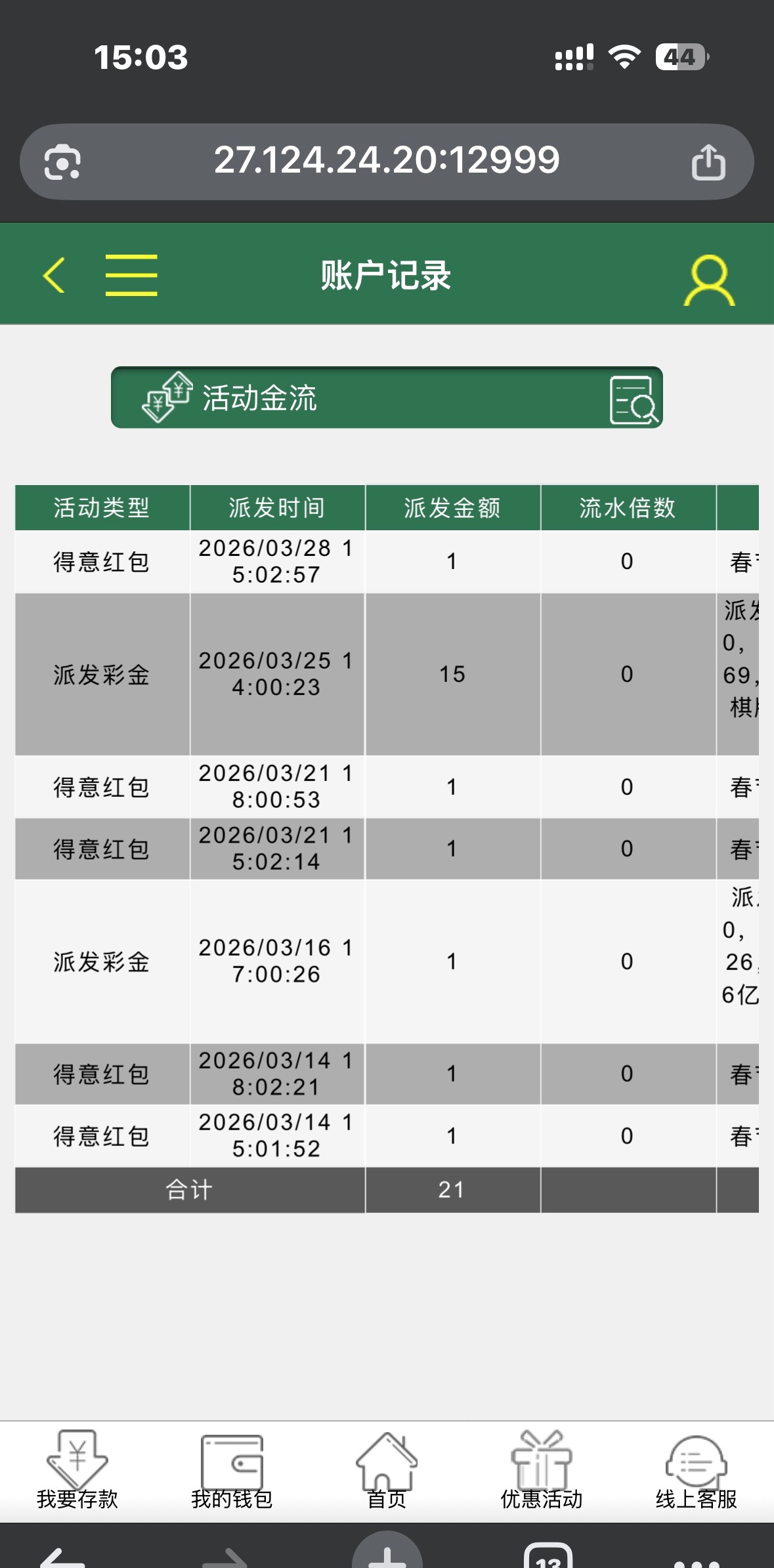 有号的自己登录看看有没有彩金,我是好几年都没充过一分的,不管你打多少流水冲多少钱,每周六抢红包都是一块!链接417.com